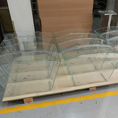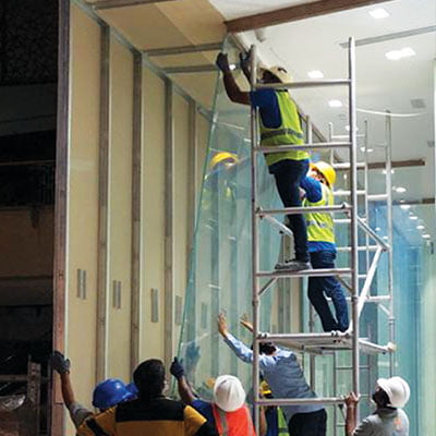 We offer glass works services including glass cutting, polishing, straight and round beveling, stained glass, glass cutouts, plain and engraved sandblasting, curved glass works, on-glass design, frameless shop fronts, double-glazed; and more as part of our interior fit-out expertise.